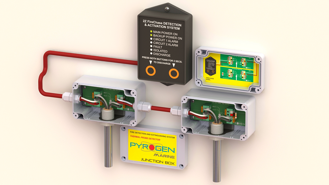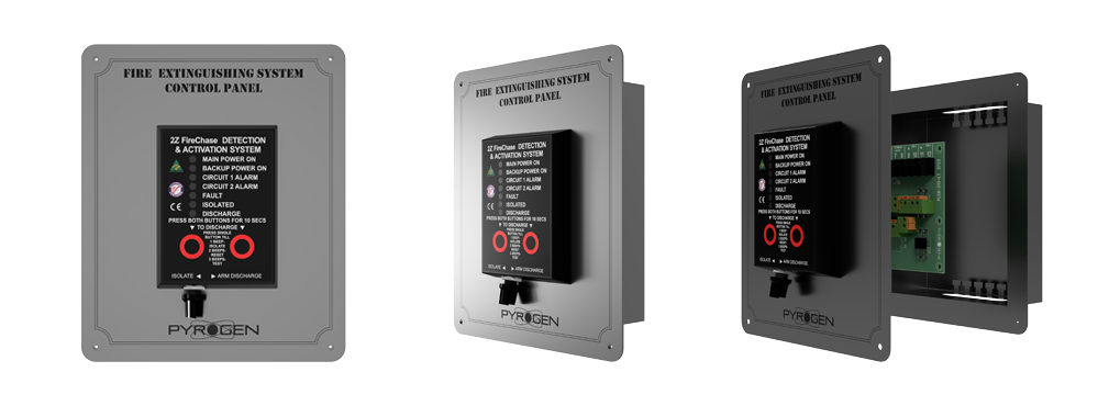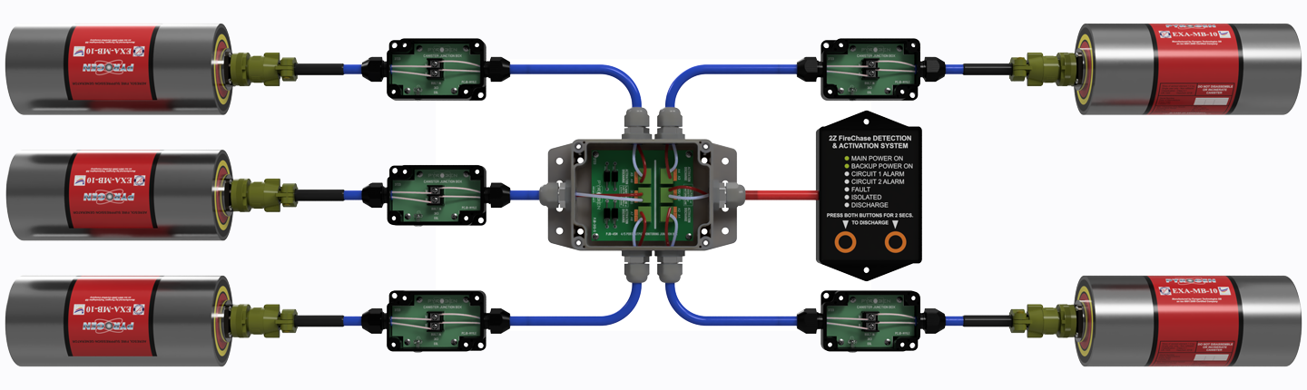 BÜYÜK TEKNELER İÇİN MERKEZİ KONTROL PANOSU Pano içinde proje söndürme hacmine bağlı olarak, dahili tip hat sonu izleme devreli kanister dağıtım modülü (4/5 port activator monitoring junction box) yada çift çıkışlı güç artırma modülü (dual output booster) bulunur. Ayrıca manuel aktivasyon butonu da bulunmaktadır. Resimde görülen FireChase 2 bölgeli marine tip söndürme kontrol paneli ayrıca sipariş edilmelidir. Ana kontrol ve dağıtım kartı mikro işlemci kontrollüdür, alev dedektörü ile birlikte kullanıldığında otomatik olarak dedektörü resetleme özelliğine sahiptir. |